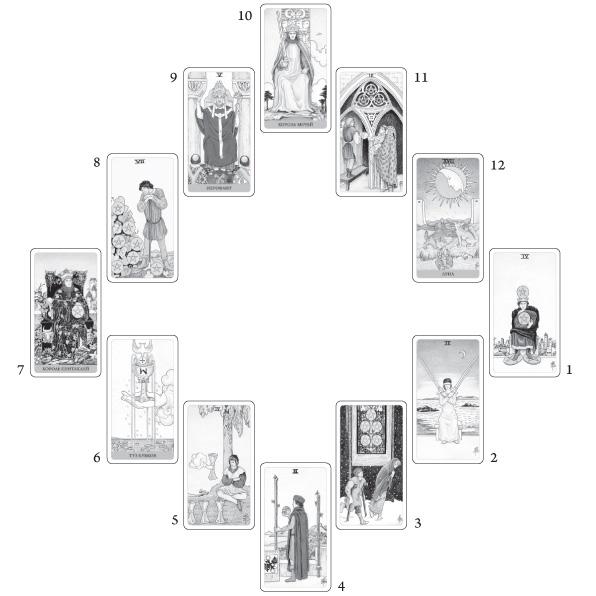 А. Уэйт предлагал выкладывать все Старшие арканы в ряд и смотреть, где именно в этом ряду оказался Шут (сигнификатор кверента). Если в начале, значит, ситуация только начала разворачиваться, если ближе к концу — все близится к завершению. Он считал, что при толковании оператор (таролог) должен выстроить «умопостигаемое откровение, сообразное данному случайному расположению карт». Толкование должно соответствовать сфере вопроса.