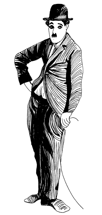 Der Kummer ist ein dicker Mann, ein roher Bursche von ungeheurem Format, mit dem Herr Chaplin sofort aneinandergerät. Weshalb, ist nicht ganz klar. Diese Filme sind überhaupt nicht ganz klar. Aber es kommt ja nicht auf[1] ihre Handlungslosigkeit an und auf das Gewirr von Prügeln, Feuerwehrschläuchen, jungen Mädchen, auslaufenden Milchflaschen und herunterfallenden Gipsbüsten. Es kommt auf ihn an, auf Mister Chaplin.