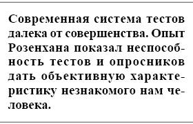 Известно, что все популярные психологические системы классификации людей по типам требуют заполнения десятков анкет и проведения различных тестов. Без этого никто вам ничего не сможет сказать о незнакомом человеке. К тому же подобные системы полезны только при приеме на работу. В повседневной жизни они не применимы. Мы не можем, например, подойти просто так к незнакомому человеку и предложить: «Простите, я хотел бы с вами подружиться, но не знаю о вас ничего. Не могли бы вы заполнить вот этот вопросник, чтобы я определил ваш характер и понял, будет ли наше общение полезным?» Можно представить себе абсурдность подобной ситуации?! А если бы это даже случилось — где гарантия, что человек ответит на вопросы искренне и честно? Он может захотеть произвести на нас хорошее впечатление. Будем ли мы способны отличить, где правда, а где ложь? Конечно же, нет. Это наглядно показал американский психолог Дэвид Розенхан еще в 1973 году, чем вызвал огромный переполох в мировом сообществе врачей-психиатров. Эксперимент Розенхана проходил в два этапа.