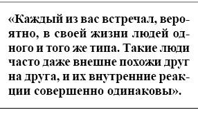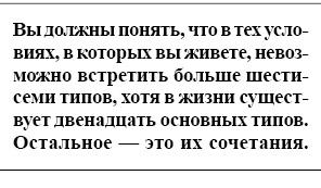 В своей повседневной жизни мы совершенно не обращаем внимания на связь между физическими качествами человека, или его «типом тела», и тем, как он воспринимает, чувствует, думает и поступает. Тем не менее, каждый из нас на интуитивном уровне чувствует, что некая классификация человеческих типов действительно существует. Это особенно хорошо видно по нашим симпатиям и антипатиям к некоторым типам людей. Если бы нам удалось сфотографировать всех людей, которые нам симпатичны, и взглянуть на все фотографии одновременно, то мы бы с удивлением заметили у них много общего. Мы не задумываемся над тем, что стоит за нашими симпатиями и антипатиями. Нам кажется, что они являются частью нашей индивидуальности и порывами нашей души. В действительности наши предпочтения довольно механичны, и в них не больше индивидуальности, чем, скажем, в положительно заряженной частице, которая в силу природных законов притягивается к отрицательно заряженным частицам и отталкивается от себе подобных. Конечно, кроме животного магнетизма и притяжения, основанного на нем, каждый человек может притягиваться к другим людям на уровне души. При этом общение душ — явление более высокого порядка. Человек с чуткой душой способен отличать телесное от душевного.