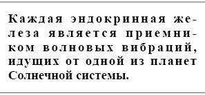 Поджелудочная железа «настроена» на вибрации Луны, паращитовидная железа — на вибрации планеты Венера. Щитовидная железа является приемником вибраций планеты Меркурий, передняя доля гипофиза — вибраций планеты Сатурн, а задняя доля гипофиза — планеты Юпитер. Надпочечники «настроены» на вибрации планеты Марс, а вилочковая железа — на вибрации Солнца.