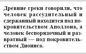 Мифы, рассказывающие о конфликтах между богами, были символическим повествованием о внутренних конфликтах и противоречиях, через которые проходит каждый человек. Яркий тому пример — противостояние Аполлона и Диониса. Аполлон являет собой порядок, рассудительность и здравый смысл. Заповеди Аполлона гласят: «Человек, знай меру», «Соблюдай границы» и «Укрощай свой дух». Дионис же приносит человеку дурман, беспредельное влечение, экстаз, безумие и побуждает нарушить все предписанные нормы и правила. Каждый из этих двух «богов» призывает человека встать на свою сторону, поэтому люди, воспринимающие их голоса как свои собственные, вынуждены проходить через внутренний конфликт между здравым смыслом и жгучим желанием удовлетворить свои телесные аппетиты и «покутить на всю катушку». Выбор влияния остается за человеком, а это формирует характер его личности, который в конечном итоге становится схожим либо с характером Аполлона, либо с характером Диониса. Недаром греки говорили, что человек рассудительный и сдержанный находится под покровительством Аполлона, а человек беспорядочный и развратный — под покровительством Диониса. Аполлон и Дионис — бессмертные боги. Их характеры и склонности остаются неизменными, а это означает, что данные виды влияния и связанная с ними борьба всегда будут иметь место во внутренней жизни человека. Это не фатализм, это внутреннее движение, которое является неиссякаемым источником энергии и одновременно свидетельством того, что человеку предоставлено право выбора.