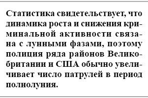 Сегодня широко известно, что женский организм полностью подчинен влиянию Луны в цикле овуляций женских половых клеток. От него напрямую зависит возможность зачатия. И это далеко не все данные о влиянии лунных фаз на человека. Так статистические исследования подтвердили, что динамика роста и снижения криминальной активности непосредственно связана с лунными фазами, поэтому полиция ряда районов Великобритании и США обычно увеличивает число патрулей в периоды полнолуний.