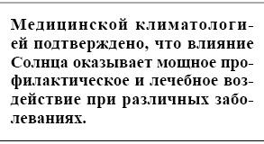 Медицинской климатологией подтверждено, что влияние Солнца оказывает мощное профилактическое и лечебное воздействие при различных заболеваниях. Облучение солнечным светом увеличивает умственную и физическую работоспособность, укрепляет вегетативную нервную систему, улучшает обмен веществ, кроветворение, эндокринную деятельность и повышает адаптационные возможности организма.