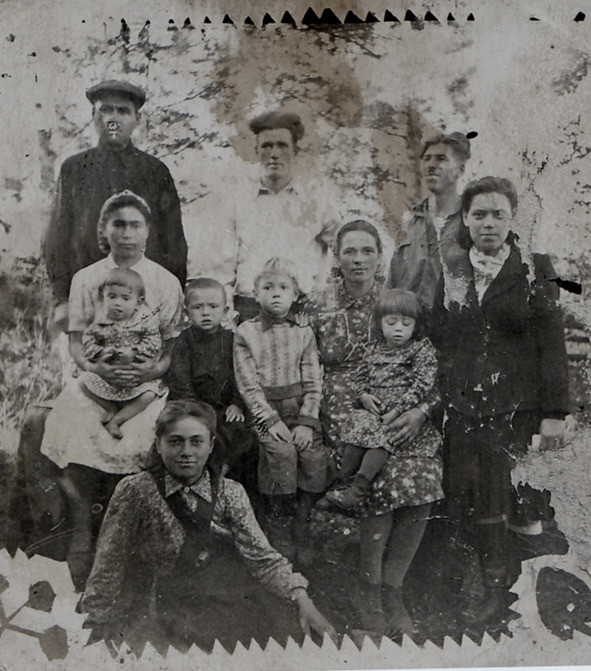 Коллективное уже за нашим огородом в Успенке. Я в центре, рядом мама с Галей. Слева от меня Вера Флоча с детьми Костей и Валюсей. За моей спиной отец. Слева от него Чемортан, отец Вали, которая сидит. Подле мамы Нина, забыл фамилию. За её спиной Вася Ротарь
