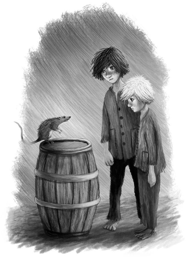 Мы с Мортимером слушали, присев на корточки, а Чернокрыс продолжал свой рассказ. Он принялся рыть так энергично, что из-под лапок вихрем летели чёрная земля, камни и червяки. Дыра становилась всё глубже. Дни сменялись ночами, но Чернокрыс не бросал труда. И вот в один прекрасный день он пробежал под землёй и выбрался на поверхность по ту сторону лаза. Но воздух в том месте оказался совсем не свежим и не сладким: он был густым от жжёного угля и выдохов паровых машин, он был скверным от нечистот и мусора. Чернокрыс увидел фабрики и дома. Увидел готовые рухнуть лачуги, увидел мощёные улицы — и везде на этих улицах бегали дети. Иные были чистенькими, с розовыми щеками.