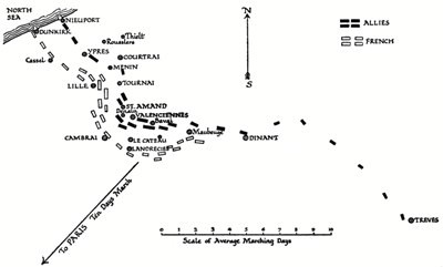 It will thus be seen that the allies, at the moment when the plan was about to be formulated, lay on either side of the French wedge, and that any scheme for cutting off that wedge from the main French line must consist in causing a great force of the allies to appear rapidly and unexpectedly between Courtrai and Lille.