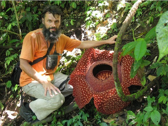Ботаник обрадовал меня, сказав, что два дня назад расцвёл Очень Большой Цветок, но до него нужно топать два километра через джунгли (так и оказалось, действительно неблизко). Свои хлопоты по посещению леса со мною ботаник оценил примерно в $3. Я был на всё согласен, и мы поднялись над рисовыми полями, почвякали по грязи и ручью, поднялись вверх по склону, покрытому лесом, и наконец увидели Её, гигантскую краснющую Раффлезию в вечной тени деревьев. Диаметром сантиметров шестьдесят, не меньше. Я был очень доволен.