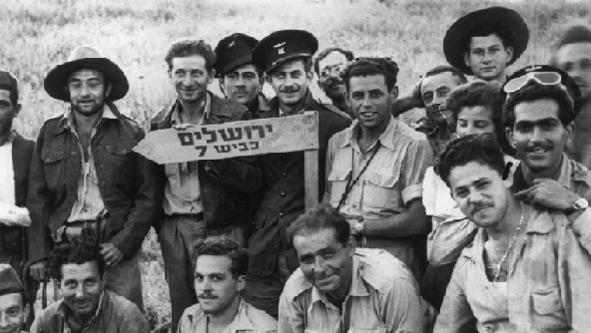 Из-за уже начинающихся военных действий Великобритания отзывает мандат раньше срока. Ее военные силы покидают Палестину. Арабы и евреи всецело предоставляются друг другу. После некоторого промедления («принцип ответных акций») военизированная организация еврейского населения Хаган переходит в наступление и отвоевывает ряд населенных пунктов. Но, 15 мая 1948 года Египет, Сирия, Ливан, Иордания, Саудовская Аравия, Ирак и Йемен нападают на только что провозглашенный Израиль. Силы сторон; арабские государства 42—54 000 человек, Армия обороны Израиля (ЦАХАЛ) — 35—45 000 человек, 9 транспортных самолетов, автоматы кустарной сборки. Еще: угловатый танк «Кромвель», украденный у англичан, 10 ветхозаветных «Гочкис», закупленных во Франции, ставших большим разочарованием, а также несколько барахлящих «Шерманов». В серии тяжелых оборонительных боев ЦАХАЛ насыщается трофейным оружием, переходит в наступление и захватывает все новые территории. Боевые действия заканчиваются 18 июля 1948 года. Потери сторон — Израиль 6300 солдат и ополченцев, союз арабских государств — от 5000 до 15 000. Беженцами становятся 600 000 арабов и 800 000 евреев. Иерусалим поделен теперь на две части — Восточную, включающую Стену Плача, Масличную гору, под управлением Иордании, и Западную, в составе Израиля. Город разделяет бетонная стена. Сектор Газа, территорию на берегу Средиземного моря, протяженностью 50 км., шириной от 6 км. до 12км., удерживает захвативший ее Египет. Здесь находят убежище многие арабские беженцы. Израиль представляет собой теперь три граничащие углами или соединенные транстерриториальными дорогами территории, так же как и три крупных арабских поселения.
