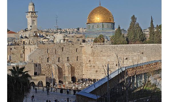 3. «Стена Плача», The Wailing Wall, на иврите Ха-Ко́тель ха-Маарави — часть древней стены (485 м.) вокруг западного склона Храмовой горы, уцелевшая после разрушения римлянами Второго Храма. По преданию, римский полководец Тит (позже, по наследованию от вторгшегося в Израиль Веспасиана — император) повелел оставить фрагмент стены, дабы представить потомкам, какие укрепления способны захватить штурмом его легионы. Это величайшая святыня евреев, от которой, по заверениям их канонических текстов, никогда не отходит Шхина (Божественное Присутствие). Полная высота стены оценивается археологами в 32 метра (на других участках доходит до 45 м.). Высота открытой ныне части 19 м., толщина 5 м. Место разрушенного в 70 г.н.э. собственно, Второго Храма занимает мечеть Эль-Акса, ведущая начало от молитвенного дома халифа Омара (7 в.н.э.), принявшего ислам непосредственно от Мохаммеда, третья по значимости святыня мусульман. На данной фотографии виден, находящийся слева от нее, золотой купол мечети Купола-над-Скалой. Это также весьма весомое по святости сооружение. Оно прикрывает участок скалы, с которого началось сотворение Мира, где стоял некогда Ковчег Завета, а пророк Мохаммед вознесся в небеса.