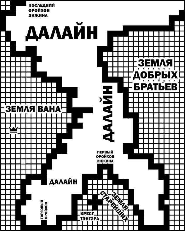 Соседи жили с двух сторон, но стороны были явно неравноценны. На востоке простиралась обширная страна, состоящая из множества оройхонов, выстроенных Ваном — илбэчем, жившим много лет назад и оставившим следы своих трудов во всех землях. Правители восточных земель называли себя ванами и возводили свой род к знаменитому илбэчу, хотя всякий знал, что древнее проклятие обрекало строителя оройхона на одиночество. Но противоречить царственному мнению никто не смел, тем более что удачливый Ван умер неразгаданным, и теперь на его счёт можно было строить какие угодно домыслы. Ближайший восточный оройхон выходил на далайн лишь одним углом, и хотя жизнь на нём, казалось, была такой же, что и на пострадавшем острове, но считался он особым, ибо прикрывал сухие земли царствующего вана. Соваться туда — значит столкнуться с хорошо вооружёнными и безжалостными цэрэгами, охраняющими от вторжения чужаков перенаселённые земли. Ясно, что на восток пути не было, в добрые времена цэрэги могли торговать, но никакой помощи не оказывали ни прежде, ни тем более сейчас.