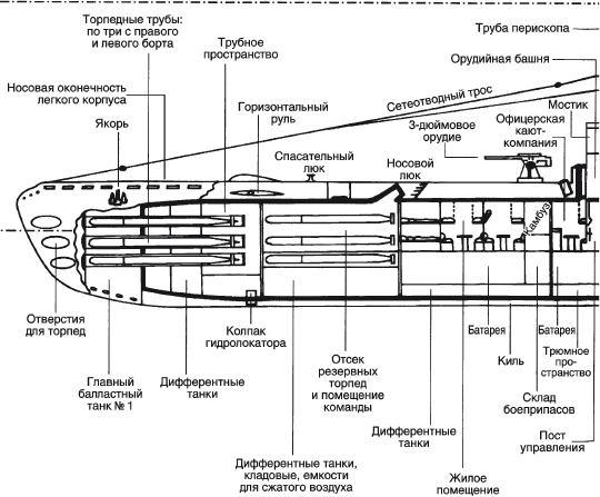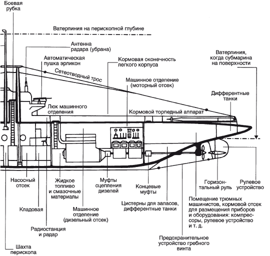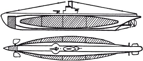 Жирными линиями показан прочный корпус субмарины. Все, что находится вне его (кроме торпедных труб), при погружении субмарины оказывается затопленным.