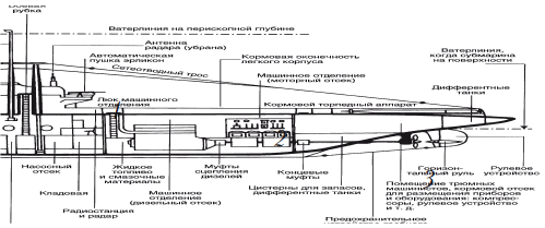 Двойными вертикальными линиями показаны водонепроницаемые переборки между отсеками, рассчитанные на такое же давление, как и прочный корпус субмарины.