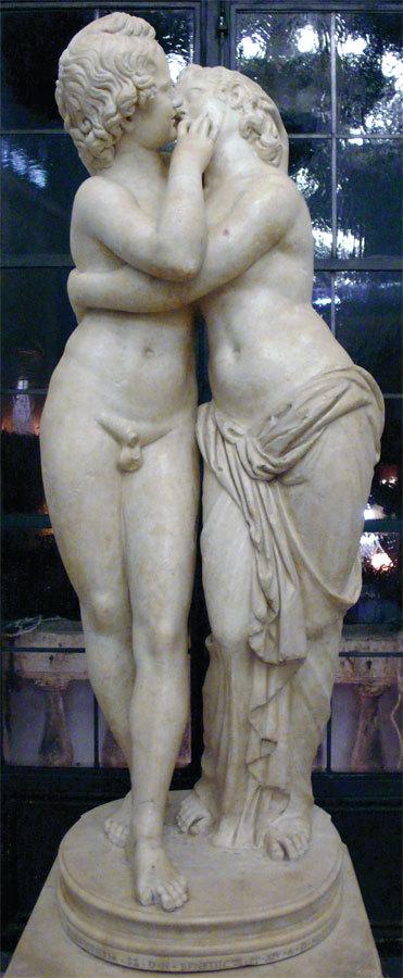 В эпоху Эллинизма широкое распространение получил миф о Гермафродите, существе, соединившем в себе мужские и женские половые признаки. Сын Гермеса и Афродиты, которого они поручили заботам нимф, обитавших во фригийских лесах на горе Ида[10], обладал сверхчеловеческой красотой. Это не могло укрыться от глаз нимфы Салмакиды, жившей при одноименном источнике, в Карии. Она открылась юноше, но получила решительный отказ. Ее желание было слишком сильным, и она не могла отказаться от него. Однажды обнаженный Гермафродит погрузился в воды озера, Салмакида обхватила его тело и пожелала слиться с ним навсегда в объятиях. И боги услышали ее мольбу.