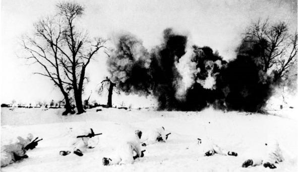 Гляжу на Худякова, потом опять вперед. Сверкает еще несколько разрывов возле колокольни. Бойцы у снежной грядки вдруг шевелятся, вскакивает фигурка в белом и что-то выкрикивает.