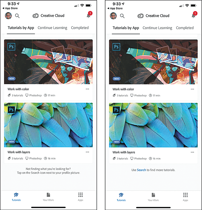 Рис. 1.1. На скриншотах «было» (слева) и «стало» (справа) — страницы мобильного приложения Adobe Creative Cloud. В конце списка туториалов показан текст, приглашающий воспользоваться поиском, если нужного материала нет в списке