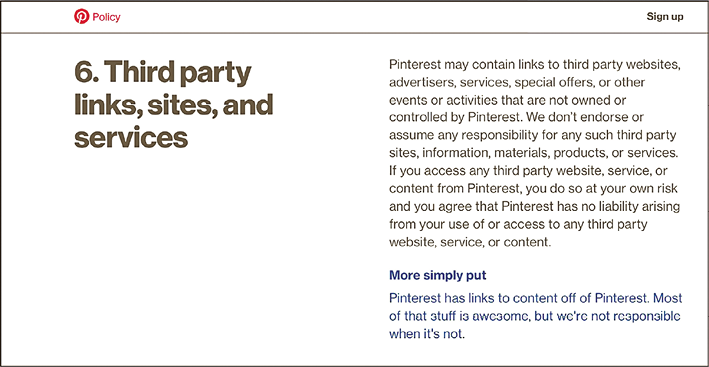 Рис. 1.3. В условиях обслуживания Pinterest слова применяются для проектирования опыта, значительно более полезного, чем большинство юридических соглашений, к которым принуждают пользователей5
