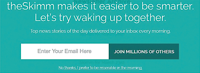 Рис. 1.4. Никто не мечтает чувствовать себя несчастным по утрам, но theSkimm вынуждает людей признаваться в том, что им этого хочется. Этот скриншот взят с confirmshaming.tumblr.com, где находится целая коллекция подобных примеров