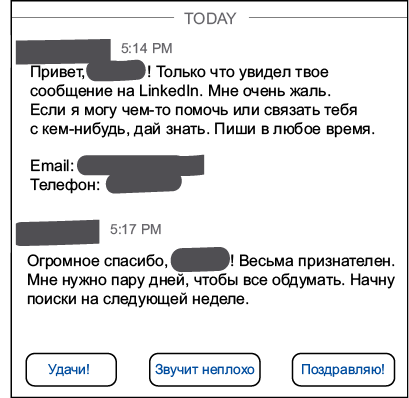 На рис. 1.5 приводится беседа двух человек на LinkedIn. Один из них предлагает помощь знакомому, который недавно был уволен. Тот в ответ благодарит и сообщает, что ему нужно некоторое время на осознание произошедшего.