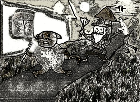 Выбежав со своими друзьями, игрушками: цыплёнком, енотом и псом, во двор, она от удивления открыла ротик! По двору во всю свою толстую кошачью прыть на максимуме, используя жизненные ресурсы, изнемогая от физического перенапряжения, бежал знакомый нам кот с искажённой от испуга мордой, сильно напоминавшей поздние работы Пикассо. За ним с веником в руках, явно не в хорошем расположения духа, мчался гномик — страж волшебной страны сказок из соседнего заброшенного дома.