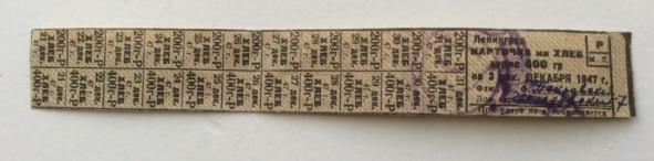 У меня сохранились уже ненужные карточки на последнюю декаду декабря 1947 г. (400 г для взрослого и 200 г для ребёнка в день).