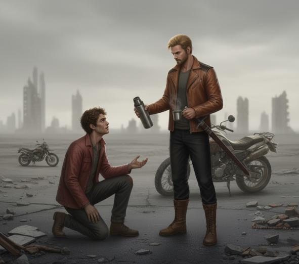 All’improvviso, in lontananza, vide una figura. Era piccola e tremante, e camminava a fatica nella sabbia. Robert avvicinò la moto con cautela. Era un uomo, vestito con una giacca rossa e jeans. La giacca era diversa dai normali stracci dei sopravvissuti. L’uomo alzò una mano debole, i suoi occhi pieni di una stanchezza infinita.