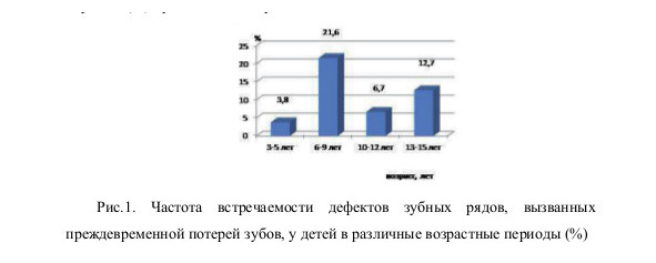 В связи с этим возникает необходимость разработки новых подходов в оказании стоматологической ортопедической помощи различным группам населения, в том числе детям в различные возрастные группы: в молочном, сменном и постоянном прикусах. Частота встречаемости дефектов зубных рядов, вызванных преждевременной потерей зубов, у детей в различные возрастные периоды (%) представлена на рис.1.
