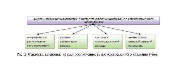 Преждевременное удаление временных и постоянных зубов, особенно первого постоянного моляра, по мнению Е. И. Гаврилов, И. М. Альшиц (1970), может быть причиной нарушения прорезывания зубов и правильной расстановки их в зубной дуге. Дело в том, что удаление зубов в детском возрасте, когда идет рост челюстей, приводит к его задержке. Вследствие этого возникает несоответствие размеров альвеолярного отростка количеству зубов и последние, прорезываясь, становятся вне дуги. Иногда может развиваться перекрестный прикус.
