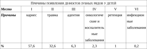 У детей количество комбинаций признаков дефектов зубных рядов значительно больше, чем у взрослых, что обусловлено сложными анатомотопографическими взаимоотношениями между временными и постоянными зубами, незавершенностью роста и развития челюстно-лицевой области. В связи с эти представляет определенную сложность классифицировать зубные ряды с дефектами, встречающиеся в различные возрастные периоды. Причины появления дефектов зубных рядов у детей представлены в Таблице 1.