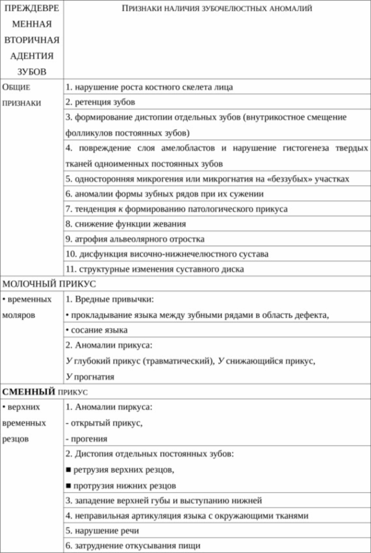 Многообразие этиологических факторов и клинических форм дефектов зубных рядов у детей требуют особого отношения к данной патологии, так как в связи с незавершенностью роста и развития челюстно-лицевой области нарушенная интактность зубных рядов является пусковым механизмом развитая деформаций и отражается на деятельности других органов и систем. На основании вышеизложенного, Флейшер Г. М. предлагает таблицу 2 развитие зубочелюстных аномалий при преждевременном удалении зубов у детей и подростков.