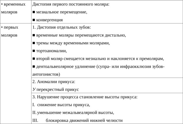 В том случае, если первый постоянный моляр на нижней челюсти прорезался в отсутствие вторых временных моляров — основных фиксаторов высоты прикуса на этом этапе развития, то установка первого постоянного моляра в зубной дуге может идти неправильно. Прежде всего, первые постоянные моляры, не имея мезиальной опоры со стороны вторых временных моляров, перемещаются кпереди, в результате чего укорачивается зубная дуга и уменьшается протяженность дефекта, образовавшегося после удаления временных моляров.