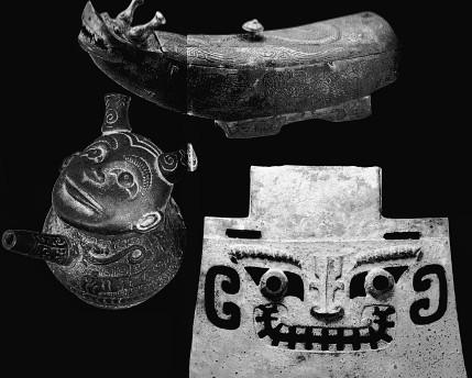 На топоре (внизу) изображено лицо с густыми бровями, прямым носом и большими глазами. Крышка чайника (слева) выполнена в виде головы человека с явно не китайскими чертами. Узоры на чайнике и на шкатулке в виде рогатого крокодила (вверху) воспроизводят декор сосудов Центральной Америки.