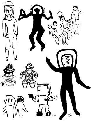 • фрески Тассили, открыты в Сахаре. На них изображения «марсиан» величиной в несколько метров, в костюмах, похожих на скафандр (так называемый «Великий бог из Джабаррена» и др.), которым 4–8 тыс. лет. Подобный «скафандр» и на этрусских изображениях;