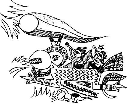 На них мы видим, как врачи эпохи динозавров применяли для анестезии акупунктуру (иглоукалывание). На одном из камней (около метра в диаметре) изображены женщина и двое мужчин-целителей. Можно разглядеть выпуклый живот женщины, ее набухшие груди и ребенка в нижней части брюшной полости: речь идет о беременной женщине с уже зрелым плодом. Плод перевернут; один из хирургов касается живота женщины режущим инструментом, и это означает, что она подвергается операции кесарева сечения. Во рту второго хирурга изображен лист – символ жизни; другой лист указывает на режущий инструмент, – значит, ребенок жив. Первый хирург держит во рту иглы, с помощью которых проводится обезболивание, методом иглоукалывания нервных центров. На руках второго хирурга заметны такие же линии, как на листе. Он с помощью того же механизма превращает солнечную энергию и передает ее режущему инструменту, используя в качестве проводника свои руки. По-видимому, речь идет об электронном бистури (тип хирургического ножа). А стрела, направленная на точку под животом женщины, означает, что от этой точки будет проведено рассечение вниз. Интересная особенность отличает фигуру женщины: одиннадцать пирамидок вдоль тела – это символ сложного механизма по улавливанию, аккумулированию и распределению энергии. В данном случае речь идет о биологической энергии человека. Число пирамидок свидетельствует о времени, в течение которого ребенок «собирал» биологическую энергию в утробе матери. Пирамидок одиннадцать, значит, беременность продолжалась 11 месяцев.[3] Тогда понятно, зачем понадобилось кесарево сечение: нормальный срок беременности уже прошел.