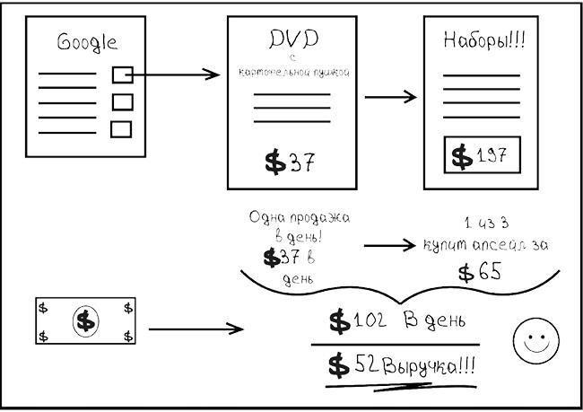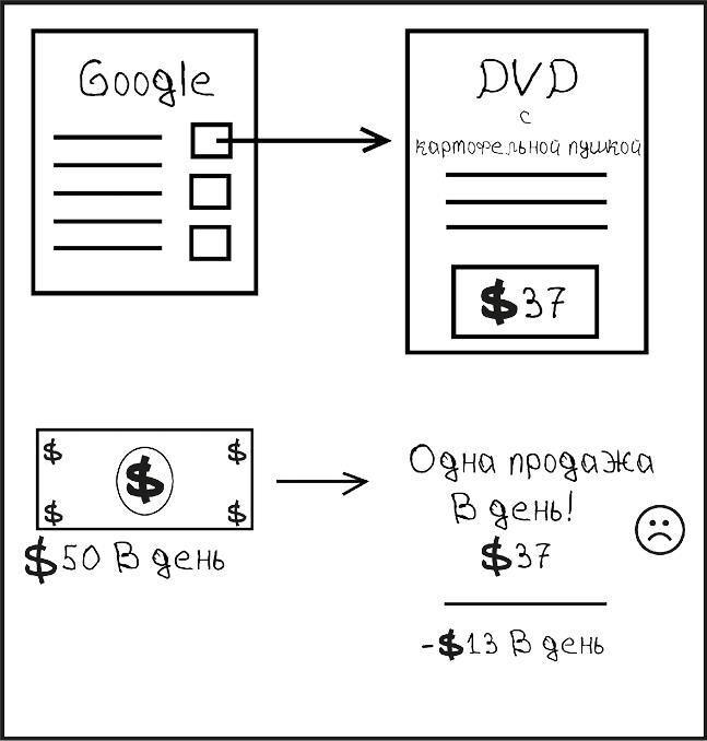 Google все еще брал с меня по 50 долларов в день за рекламу, но теперь треть клиентов приобретали мое предложение о наборе для создания картофельной пушки за 197 долларов! Это значит, что в среднем я зарабатывал дополнительные 65 долларов с каждого покупателя диска! Теперь я ежедневно тратил по 50 долларов на рекламу, но, так как я в среднем получал по 102 доллара прибыли с каждого заказа, я смог заработать по 52 доллара прибыли с каждого проданного диска. Я зарабатывал больше денег, чем раньше, до «пощечины от Google»!