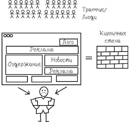 Рисунок 1.5: Традиционный веб-сайт очень похож на брошюру, где рассказывается все о компании. Но когда у посетителя сайта такой широкий выбор, продажи обычно страдают, потому что клиент теряется и не понимает, каким должен быть его первый шаг.