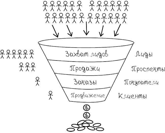 Рисунок 1.6: Воронка продаж – это все равно что клонировать вашего лучшего продавца, чтобы он проводил каждого клиента через весь процесс продаж, пока тот не достигнет желаемого для вас результата.