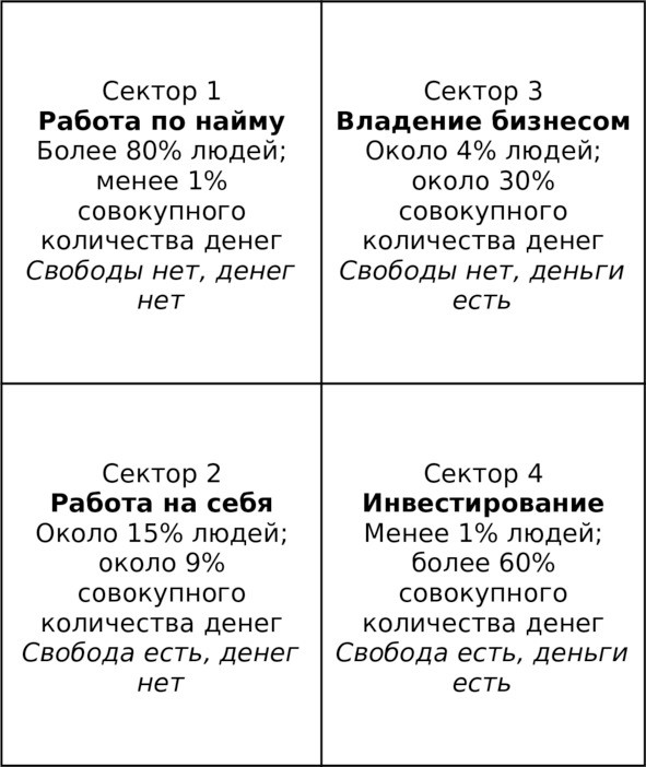 Первый сектор — работа по найму. Люди, которые здесь заняты, получают деньги только в том случае, если присутствуют на своём рабочем месте. Заработная плата зависит от объёма и качества выполненной работы. Сам работник в этом секторе старается как можно меньше работать, но как можно больше получать, а работодатель заинтересован в том, чтобы работник делал как можно больше, но получал как можно меньше. Чтобы стать богатым в этом секторе, нужно либо стать специалистом №1, либо делать то, что не умеет делать никто другой.