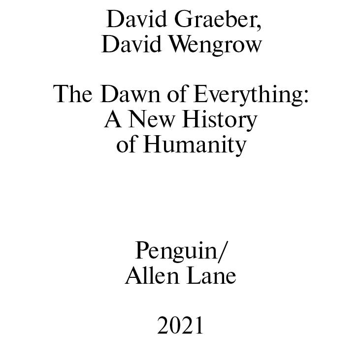 К сожалению, обстоятельства сложились таким образом, что я, Дэвид Уэнгроу, вынужден писать раздел с благодарностями в отсутствие Дэвида Гребера. Ника, жена Дэвида, пережила его. Скорбь по Дэвиду объединила людей с разных континентов, относящихся к разным социальным классам и представляющих различные идеологические лагеря. Десять лет совместной работы — это серьезный срок, но я всё равно не возьмусь гадать, кого бы он хотел поблагодарить в конце этой книги. Люди, с которыми Дэвид вместе шел по тому пути, что привел его к написанию этой книги, и так знают, как он ценил их поддержку, заботу и советы. Одно я могу сказать наверняка: этой книги не было бы (или бы она была совсем иной), не будь рядом с нами Мелиссы Флэшмен, которая вдохновляла нас, заряжала своей энергией и всегда была нашим мудрым советчиком во всём, что касается книжных дел. В лице Эрика Чински из издательства Farrar, Straus and Giroux и Томаса Пенна из Penguin UK мы нашли превосходных редакторов и настоящих интеллектуальных партнеров. Я благодарю Дэбби Букчин, Альпу Шах, Эрхарда Шюттпельца и Андреа Луку Циммерманн за то, что они многие годы активно участвовали в нашей интеллектуальной работе. Также я благодарю всех тех, кто любезно консультировал нас по разным темам, затронутым в этой книге: Мануэля Арройо-Калина, Элизабет Бакидано, Нору Бейтсон, Стивена Берквиста, Нурит Берд-Давид, Мориса Блоха, Дэвида Карбальо, Джона Чапмана, Луиза Косту, Филиппа Дескола, Александра Дьяченко, Кевана Эдинборо, Дориана Фуллера, Биссерку Гайдарска, Колина Гриера, Томаса Грисаффи, Криса Ханна, Венди Джеймса, Меган Лос, Патрицию Маканани, Барбару Элис Манн, Симона Мартина, Йенса Нотроффа, Хосе Р. Оливера, Майка Паркера Пирсона, Тимоти Пукетата, Мэттью Поупа, Карен Раднер, Наташу Рейнольдс, Маршалла Салинза, Джеймса Скотта, Стивена Шеннана и Мишель Воллстоункрофт.