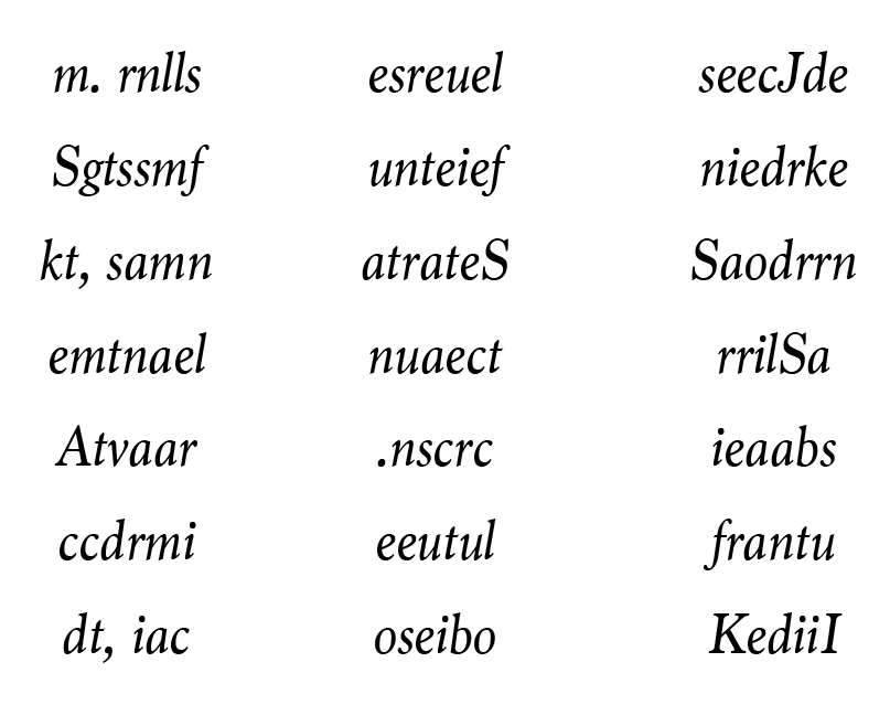 – Посмотрим, – сказал он. – При желании затемнить смысл фразы первое, что приходит на ум, как мне кажется, это написать слова в вертикальном направлении, а не в горизонтальном. Надо посмотреть, что из этого выйдет! Аксель, напиши какую-нибудь фразу на этом листке, но вместо того, чтобы располагать буквы в строчку, одну за другой, напиши их в той же последовательности, но вертикально, по пяти или по шести в столбце.