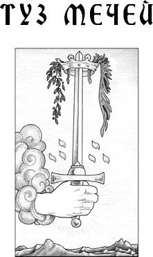 Как и все Тузы, данная карта является катализатором для всех близлежащих Арканов. Она придает им ясность и силу, а также честность и справедливость. Как мы увидим позже, Туз Мечей является единственной однозначно положительной картой своей масти, так как остальные Мечи несут в себе много боли и страдания.