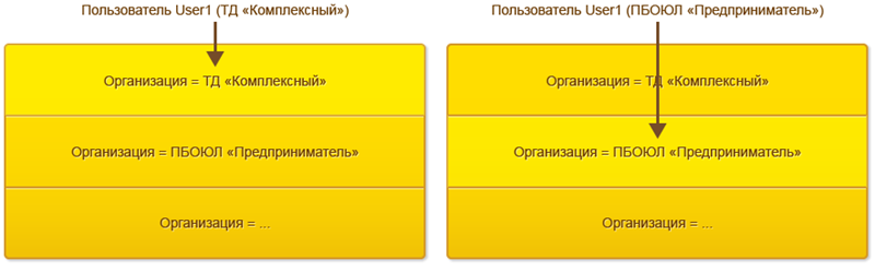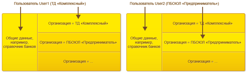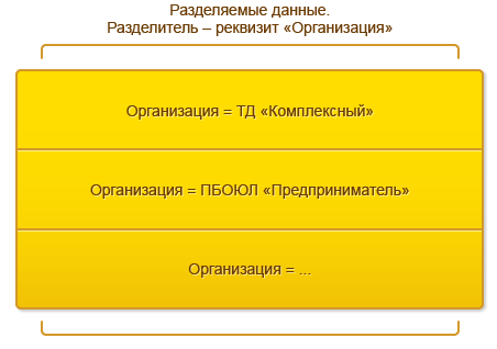 То есть в обычном режиме (без использования разделения данных) каждая организация запускает свой отдельный экземпляр программы, и видит в ней только свои данные, потому что других данных изначально там нет. А в режиме разделения данных все организации запускают один и тот же экземпляр программы, но видят в ней только свои данные. При этом у них создается ощущение, что с программой работают только они, потому что они видят только ту часть данных, которая относится к их области.