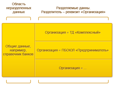 Механизм разделения данных позволяет хранить данные нескольких независимых организаций в одной информационной базе. В режиме разделения данных все эти организации используют один и тот же экземпляр прикладного решения (одну и ту же информационную базу) для работы со своими данными.