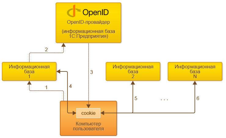 - 5, 6 – при обращении к другой информационной базе, пользователю не нужно снова вводить логин и пароль; на основании признака аутентификации, сохраненного ранее в cookie, OpenID-провайдер выполняет аутентификацию незаметно для пользователя.