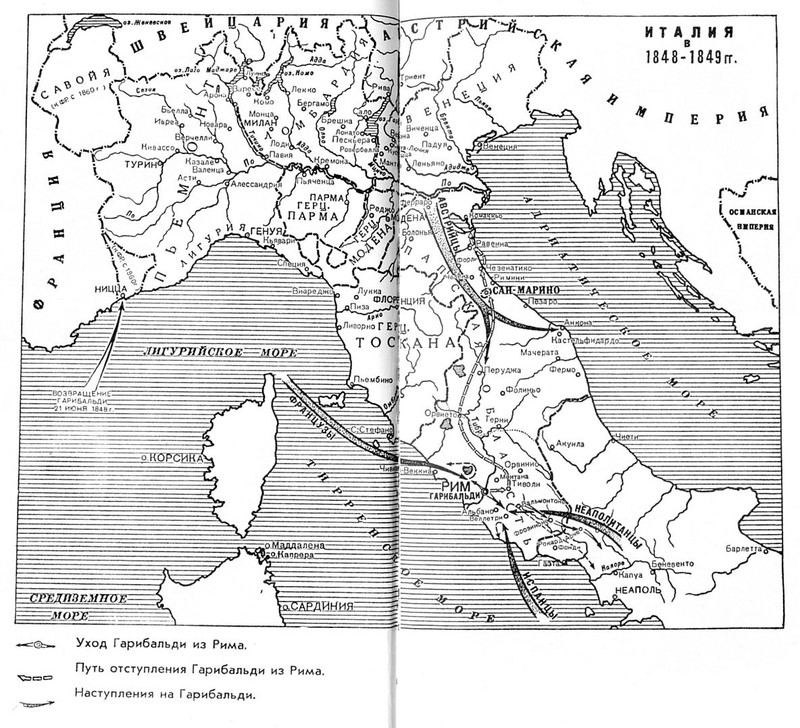 Перейдя итальянскую границу, волонтеры положили оружие и сдались войскам Виктора Эммануила. Гарибальди отправился было на Капреру, но был арестован на небольшой станции в двух часах пути от Флоренции. Напрасно генерал протестовал, против ареста, называл его незаконным действием со стороны властей и требовал, чтобы ему показали формальный приказ о задержании. Лейтенант Камоцци, получивший приказ арестовать его, не сдавался ни на какие доводы. Когда же Гарибальди наотрез отказался следовать за ним, его повалили на землю и на руках отнесли в вагон. Бывший диктатор был отвезен в Специю, а оттуда в крепость Вариньяно. Несмотря на все старания полиции скрыть от жителей Специи приезд Гарибальди, весть эта быстро распространилась по городу. Как только прибыл поезд, привезший народного героя, громадная толпа, несмотря на позднее время, хлынула на вокзал. Многочисленная стража, окружавшая генерала, не могла справиться с ее напором. Мигом были выпряжены лошади из экипажа, предназначенного для Гарибальди, и вместо того, чтобы отправиться в холодные, неуютные стены Вариньяно, он среди громких “evviva!” был привезен в лучшую гостиницу города, где его ожидал роскошный ужин и прекрасная постель. После короткого отдыха, опасаясь дальнейших демонстраций со стороны народа, провожавшие генерала офицеры препроводили его в Вариньяно. Арест Гарибальди вызвал волнения и демонстрацию во всех больших городах Италии; в Милане вспыхнуло серьезное восстание, которое пришлось подавить войсками, причем произошло сильное кровопролитие. Даже Париж откликнулся на это событие; там произошла демонстрация над могилами Манина и Кавеньяка; после многократных требований со стороны правительства разойтись и многочисленных арестов толпа разбрелась с криками: “Да здравствует Гарибальди, да здравствует мир! Не надо вмешательства!”