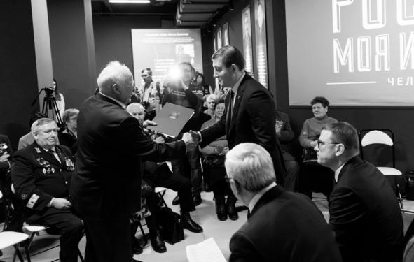 От имени ветеранов благодарю А. Л. Текслера, В. В. Мякуша, партию «Единая Россия» и её секретаря А. А. Турчака за поддержку в получении звания.