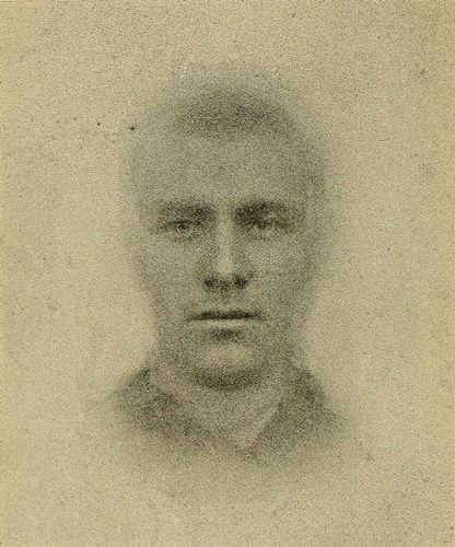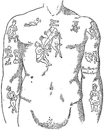 Tattoo marks on the two fore-arms: on the right a transfixed heart, a woman’s head, the letters F. and B.; on the left two stars, one large, the other small, the letters L. and A. (his initials), a cross, and nearer the wrist an indistinct sign ending in a B.