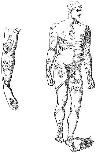 Among the insane tattooing does not seem always to be uncommon. In the lunatic asylum at Ancona, we learn from Dr. Riva,[38] out of 184 men and 147 women no fewer than 16.30 per cent. of the former, and 6.80 of the latter, were tattooed. It is worthy of note that it was chiefly among the more severe and incurable cases of mental degeneration (dementia, alcoholism, epilepsy, congenital mental weakness) that these signs were found. In character and position they differed from those usually found among criminals, by being exclusively worked on the arms and hands, and consisting only of religious symbols, especially the Madonna of Loretto.