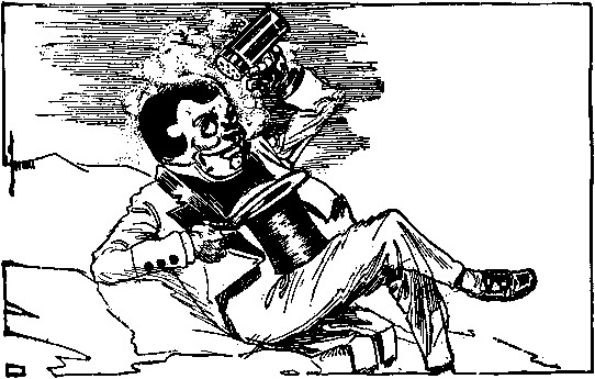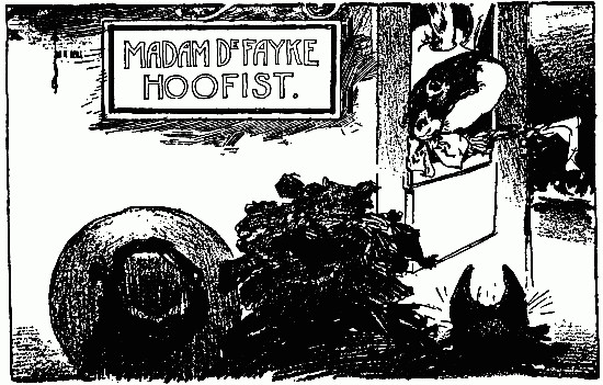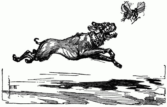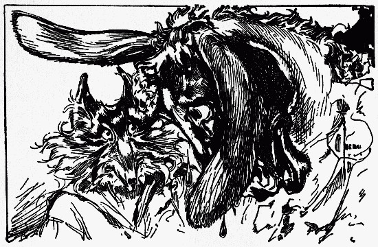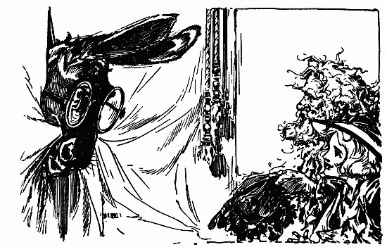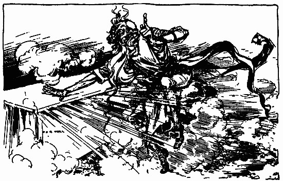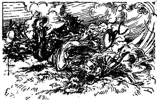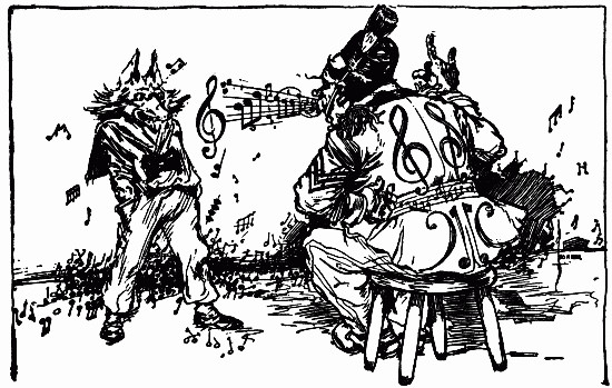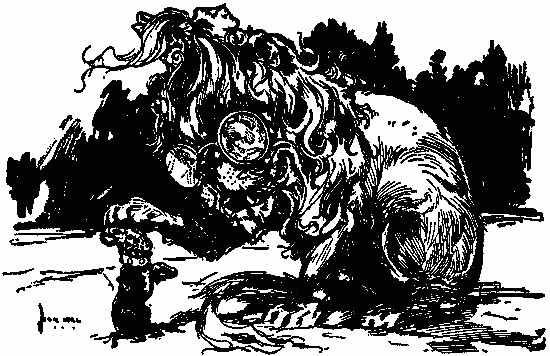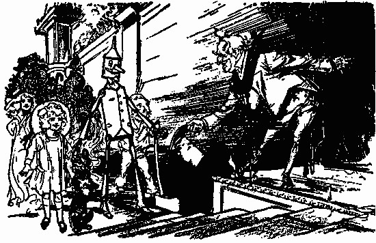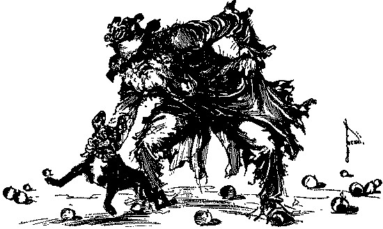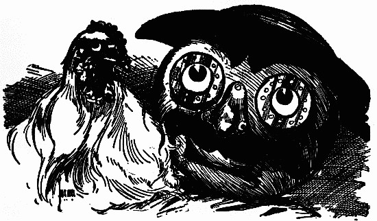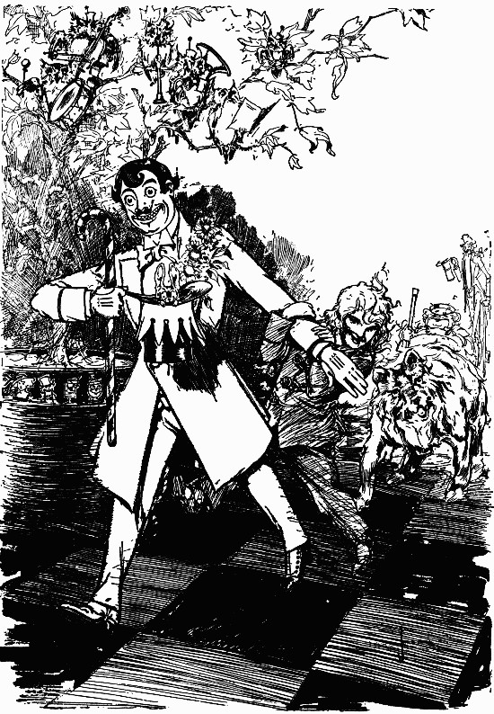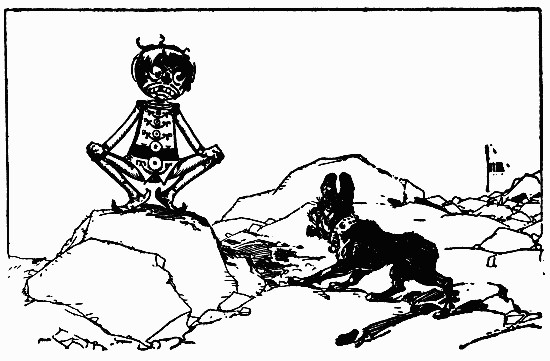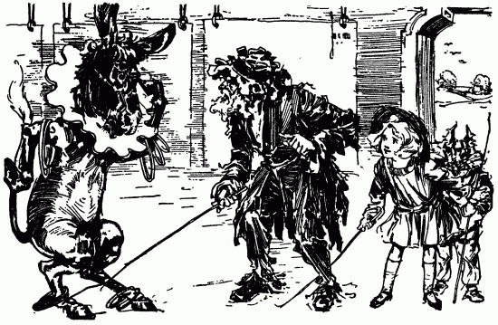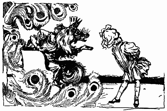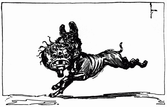 The shaggy man waited. He had an oat-straw in his mouth, which he chewed slowly as if it tasted good; but it didn't. There was an apple-tree beside the house, and some apples had fallen to the ground. The shaggy man thought they would taste better than the oat-straw, so he walked over to get some. A little black dog with bright brown eyes dashed out of the farm-house and ran madly toward the shaggy man, who had already picked up three apples and put them in one of the big wide pockets of his shaggy coat. The little dog barked, and made a dive for the shaggy man's leg; but he grabbed the dog by the neck and put it in his big pocket along with the apples. He took more apples, afterward, for many were on the ground; and each one that he tossed into his pocket hit the little dog somewhere upon the head or back, and made him growl. The little dog's name was Toto, and he was sorry he had been put in the shaggy man's pocket.