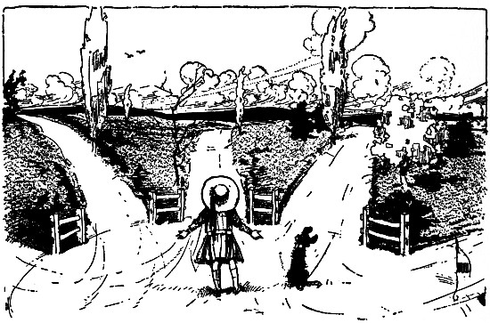 "I won't," she answered, laughing. "Here's the highway. Now, it's the second—no, the third turn to the left—or else it's the fourth. Let's see. The first one is by the elm tree; and the second is by the gopher holes; and then——"